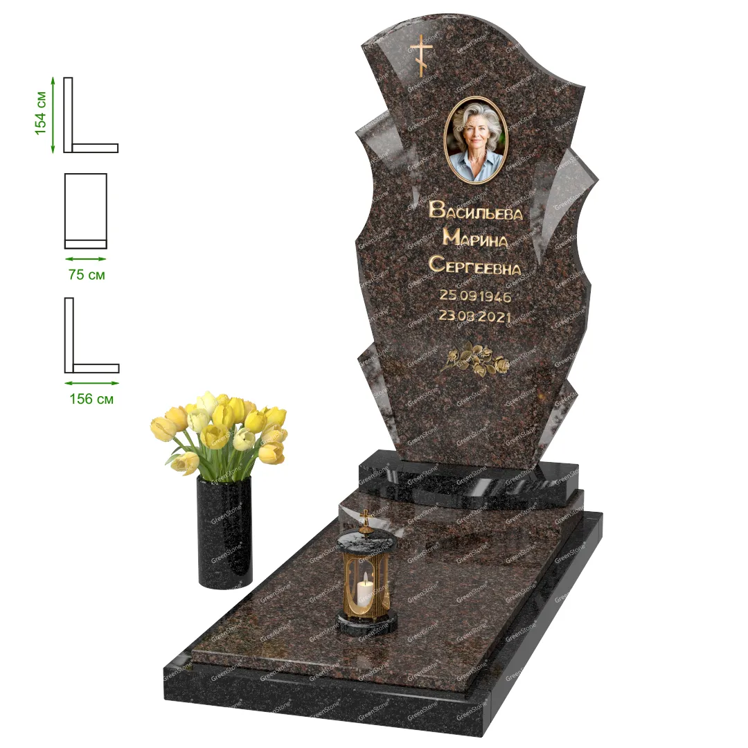 Визуально комплекс отличается от типовой формы не только формой, но и размерами. Массивная стела позволяет дизайнеру реализовать практически любые задумки и пожелания Заказчика, придать готовому изделию солидный вид, раскрыть все достоинства использованного в его изготовлении гранита. Такой габаритный памятник требует профессиональной доставки и установки. Все это также можно заказать в мастерской Грин-Стоун.