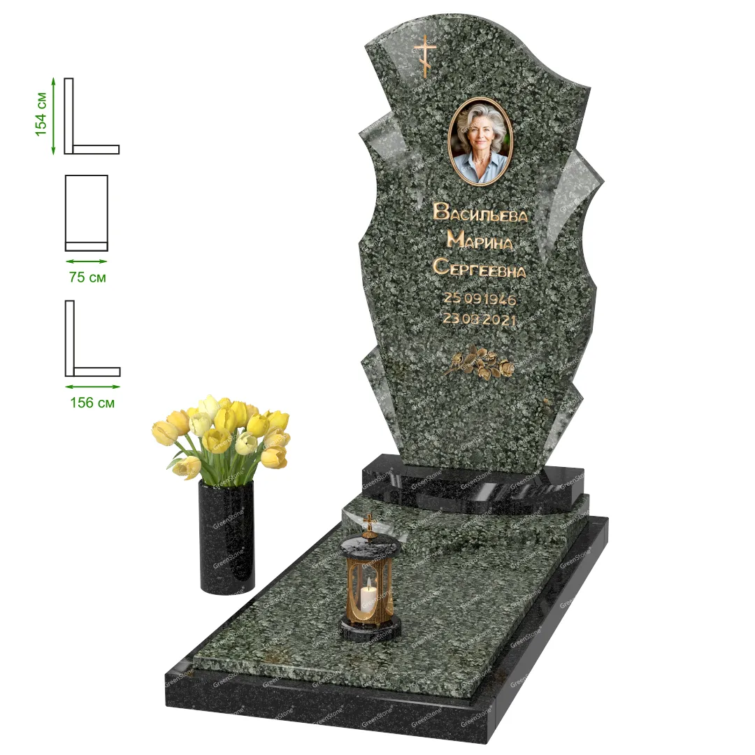 Визуально комплекс отличается от типовой формы не только формой, но и размерами. Массивная стела позволяет дизайнеру реализовать практически любые задумки и пожелания Заказчика, придать готовому изделию солидный вид, раскрыть все достоинства использованного в его изготовлении гранита. Такой габаритный памятник требует профессиональной доставки и установки. Все это также можно заказать в мастерской Грин-Стоун.