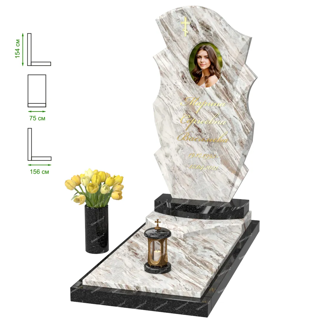 Визуально комплекс отличается от типовой формы не только формой, но и размерами. Массивная стела позволяет дизайнеру реализовать практически любые задумки и пожелания Заказчика, придать готовому изделию солидный вид, раскрыть все достоинства использованного в его изготовлении гранита. Такой габаритный памятник требует профессиональной доставки и установки. Все это также можно заказать в мастерской Грин-Стоун.