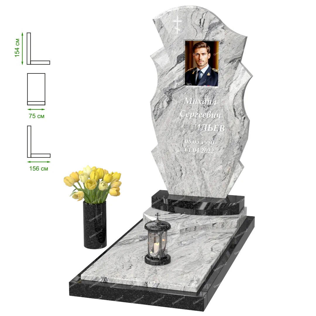 Визуально комплекс отличается от типовой формы не только формой, но и размерами. Массивная стела позволяет дизайнеру реализовать практически любые задумки и пожелания Заказчика, придать готовому изделию солидный вид, раскрыть все достоинства использованного в его изготовлении гранита. Такой габаритный памятник требует профессиональной доставки и установки. Все это также можно заказать в мастерской Грин-Стоун.