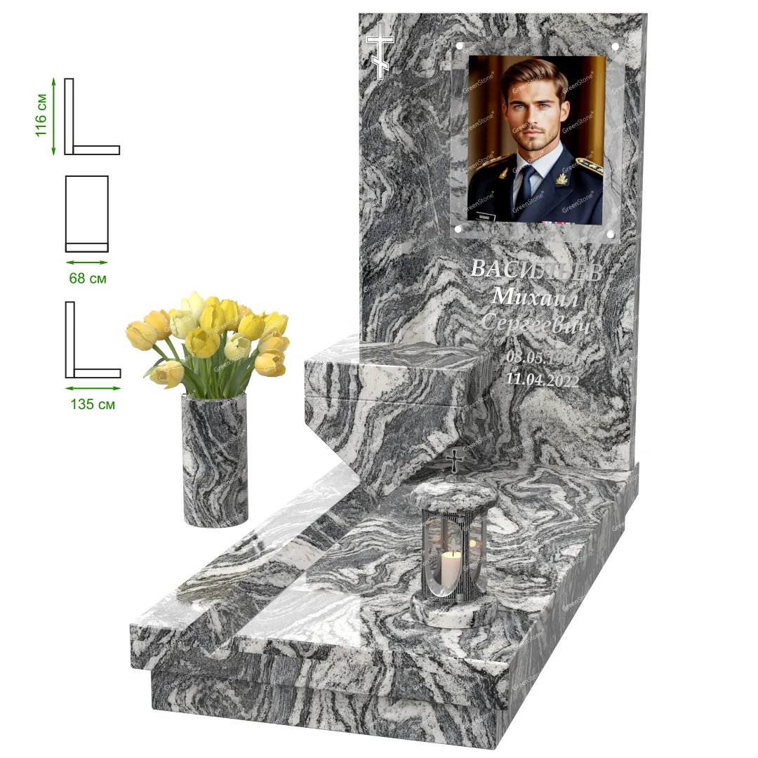 Визуально комплекс отличается от типовой формы не только формой, но и размерами. Массивная стела позволяет дизайнеру реализовать практически любые задумки и пожелания Заказчика, придать готовому изделию солидный вид, раскрыть все достоинства использованного в его изготовлении гранита. Такой габаритный памятник требует профессиональной доставки и установки. Все это также можно заказать в мастерской Грин-Стоун.