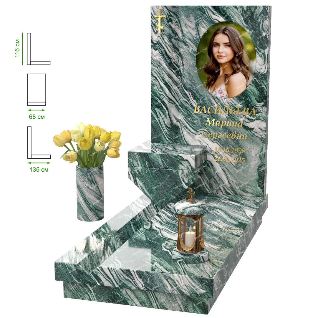 Визуально комплекс отличается от типовой формы не только формой, но и размерами. Массивная стела позволяет дизайнеру реализовать практически любые задумки и пожелания Заказчика, придать готовому изделию солидный вид, раскрыть все достоинства использованного в его изготовлении гранита. Такой габаритный памятник требует профессиональной доставки и установки. Все это также можно заказать в мастерской Грин-Стоун.