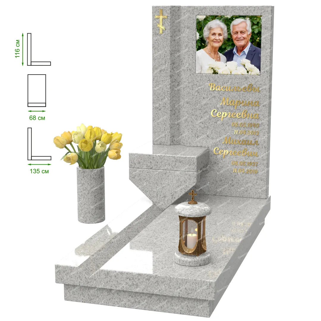 Визуально комплекс отличается от типовой формы не только формой, но и размерами. Массивная стела позволяет дизайнеру реализовать практически любые задумки и пожелания Заказчика, придать готовому изделию солидный вид, раскрыть все достоинства использованного в его изготовлении гранита. Такой габаритный памятник требует профессиональной доставки и установки. Все это также можно заказать в мастерской Грин-Стоун.