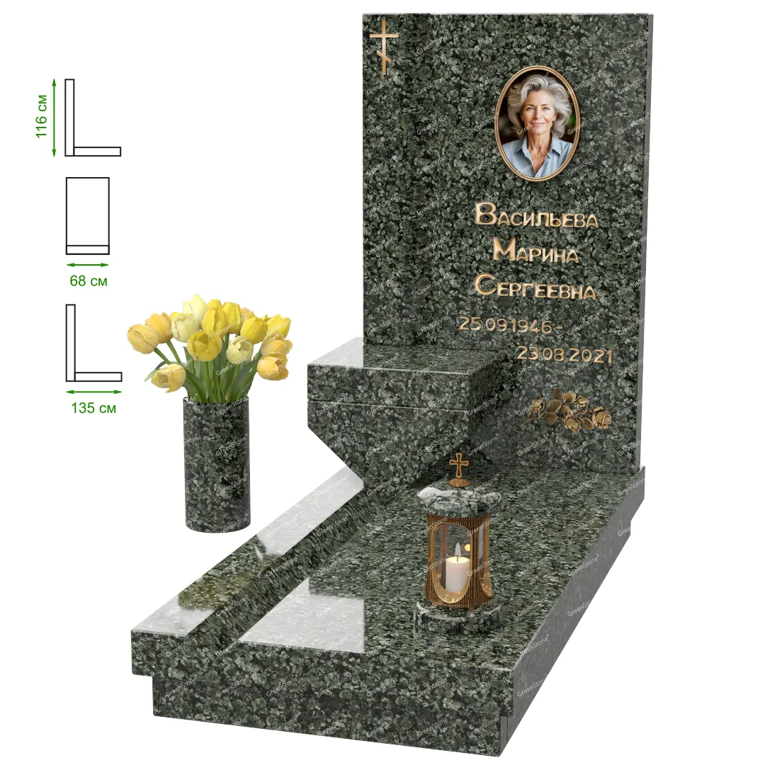 Визуально комплекс отличается от типовой формы не только формой, но и размерами. Массивная стела позволяет дизайнеру реализовать практически любые задумки и пожелания Заказчика, придать готовому изделию солидный вид, раскрыть все достоинства использованного в его изготовлении гранита. Такой габаритный памятник требует профессиональной доставки и установки. Все это также можно заказать в мастерской Грин-Стоун.