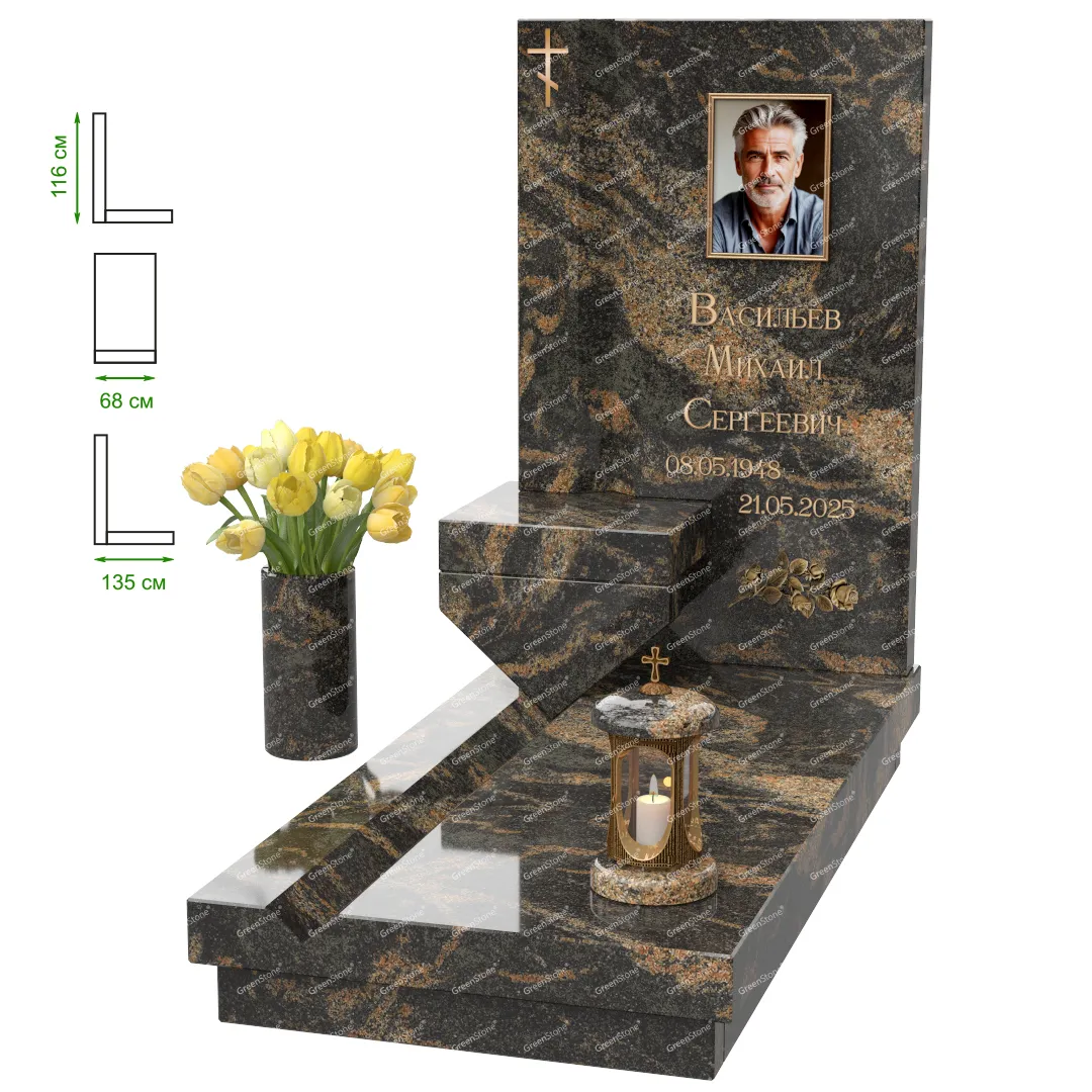Визуально комплекс отличается от типовой формы не только формой, но и размерами. Массивная стела позволяет дизайнеру реализовать практически любые задумки и пожелания Заказчика, придать готовому изделию солидный вид, раскрыть все достоинства использованного в его изготовлении гранита. Такой габаритный памятник требует профессиональной доставки и установки. Все это также можно заказать в мастерской Грин-Стоун.