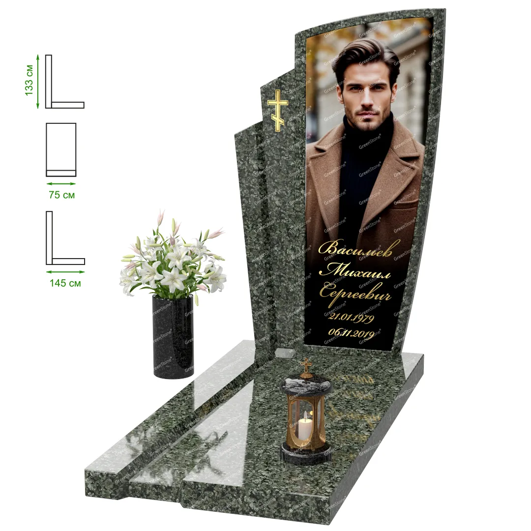 Визуально комплекс отличается от типовой формы не только формой, но и размерами. Массивная стела позволяет дизайнеру реализовать практически любые задумки и пожелания Заказчика, придать готовому изделию солидный вид, раскрыть все достоинства использованного в его изготовлении гранита. Такой габаритный памятник требует профессиональной доставки и установки. Все это также можно заказать в мастерской Грин-Стоун.