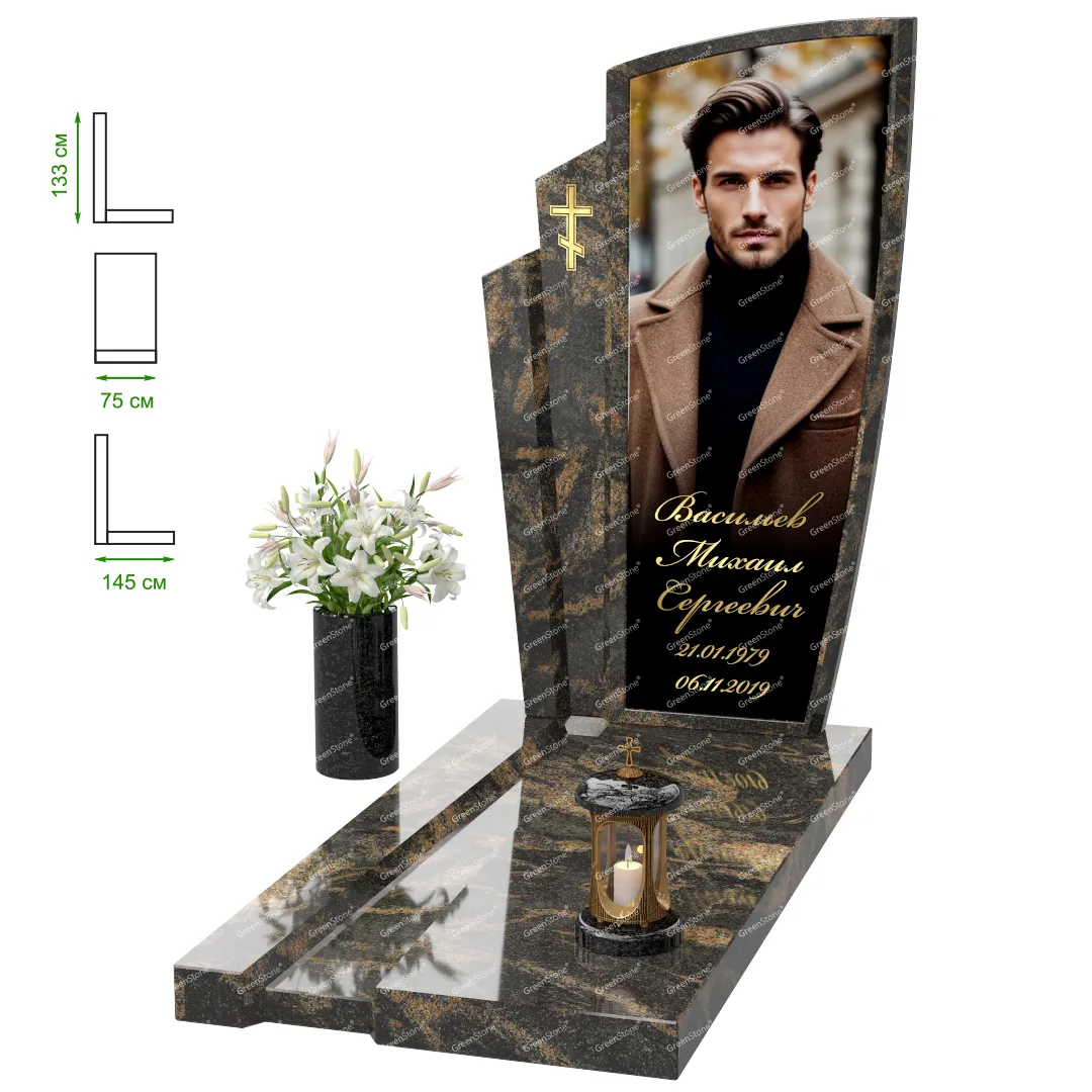 Визуально комплекс отличается от типовой формы не только формой, но и размерами. Массивная стела позволяет дизайнеру реализовать практически любые задумки и пожелания Заказчика, придать готовому изделию солидный вид, раскрыть все достоинства использованного в его изготовлении гранита. Такой габаритный памятник требует профессиональной доставки и установки. Все это также можно заказать в мастерской Грин-Стоун.