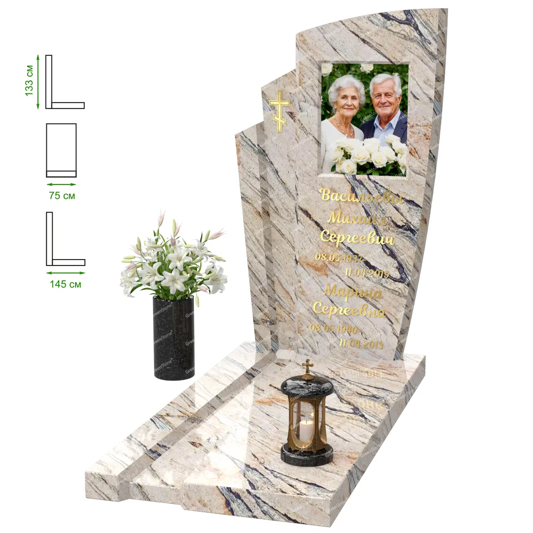 Визуально комплекс отличается от типовой формы не только формой, но и размерами. Массивная стела позволяет дизайнеру реализовать практически любые задумки и пожелания Заказчика, придать готовому изделию солидный вид, раскрыть все достоинства использованного в его изготовлении гранита. Такой габаритный памятник требует профессиональной доставки и установки. Все это также можно заказать в мастерской Грин-Стоун.