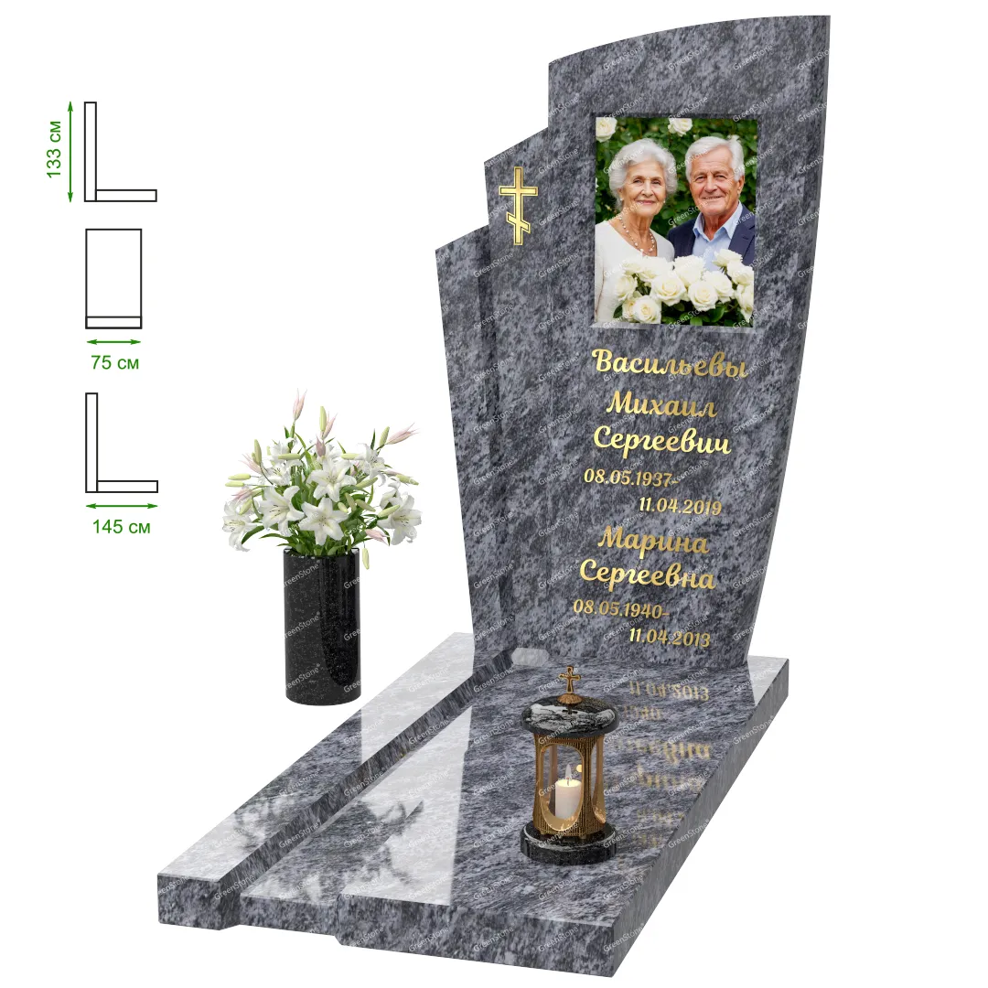 Визуально комплекс отличается от типовой формы не только формой, но и размерами. Массивная стела позволяет дизайнеру реализовать практически любые задумки и пожелания Заказчика, придать готовому изделию солидный вид, раскрыть все достоинства использованного в его изготовлении гранита. Такой габаритный памятник требует профессиональной доставки и установки. Все это также можно заказать в мастерской Грин-Стоун.