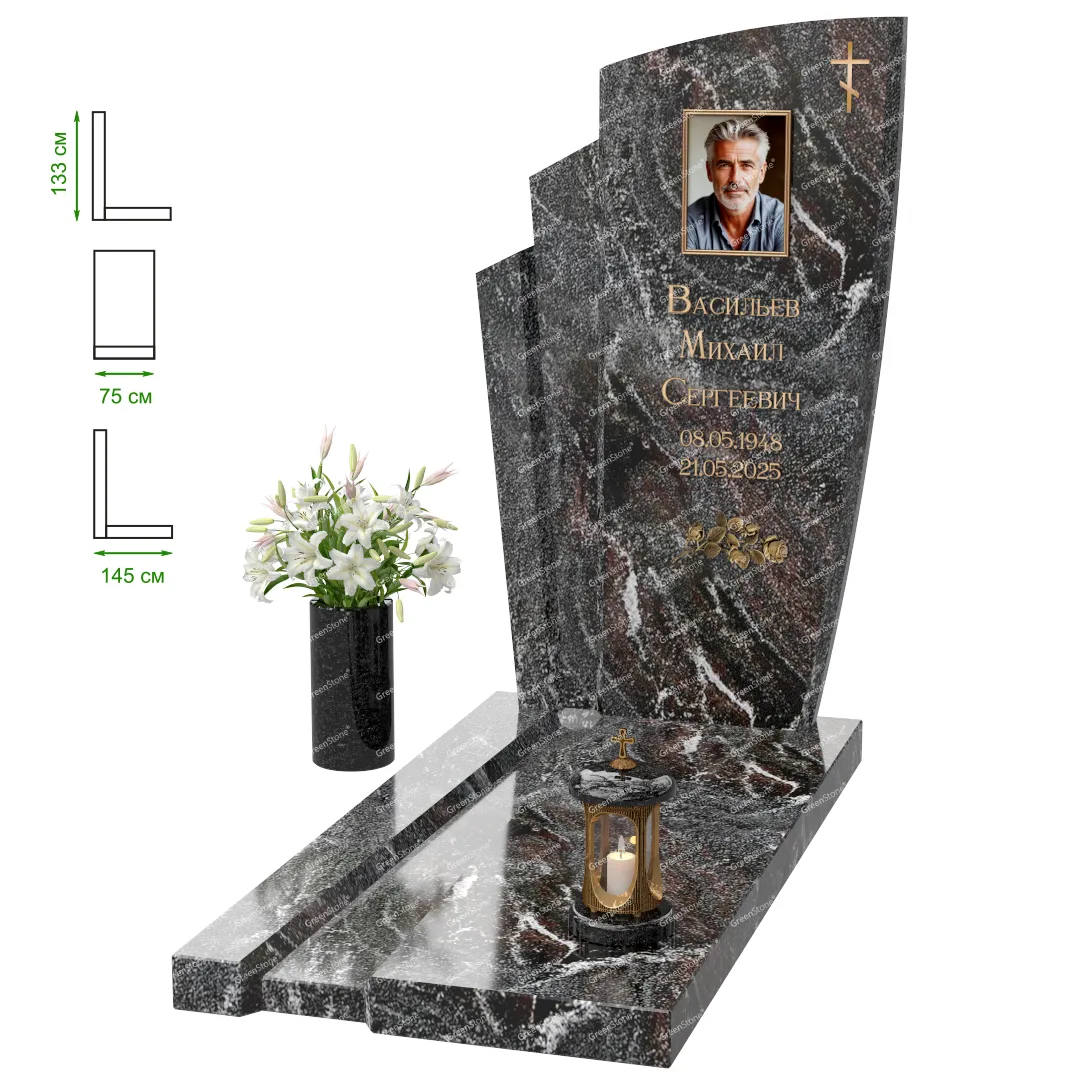 Визуально комплекс отличается от типовой формы не только формой, но и размерами. Массивная стела позволяет дизайнеру реализовать практически любые задумки и пожелания Заказчика, придать готовому изделию солидный вид, раскрыть все достоинства использованного в его изготовлении гранита. Такой габаритный памятник требует профессиональной доставки и установки. Все это также можно заказать в мастерской Грин-Стоун.