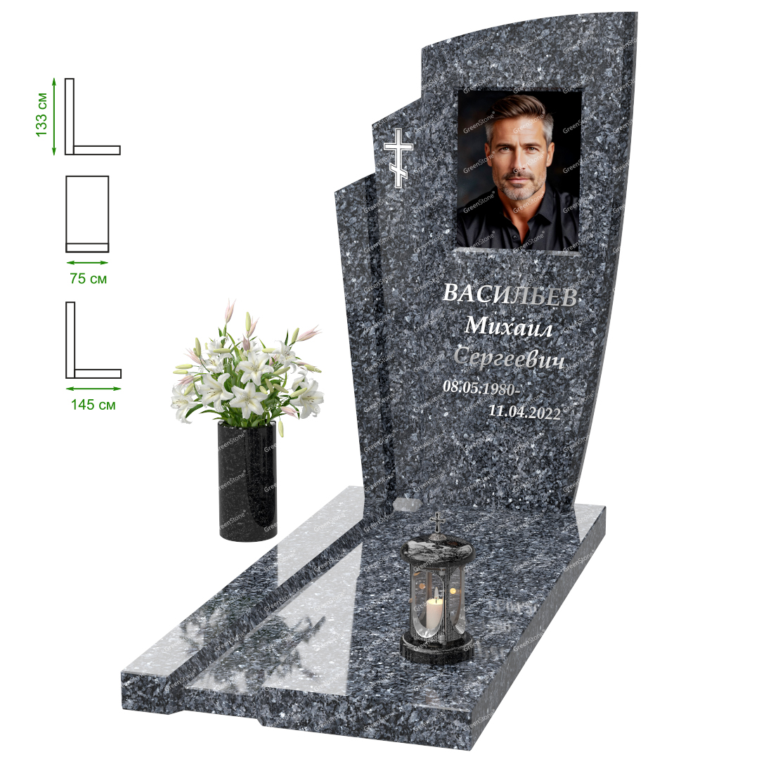 Визуально комплекс отличается от типовой формы не только формой, но и размерами. Массивная стела позволяет дизайнеру реализовать практически любые задумки и пожелания Заказчика, придать готовому изделию солидный вид, раскрыть все достоинства использованного в его изготовлении гранита. Такой габаритный памятник требует профессиональной доставки и установки. Все это также можно заказать в мастерской Грин-Стоун.