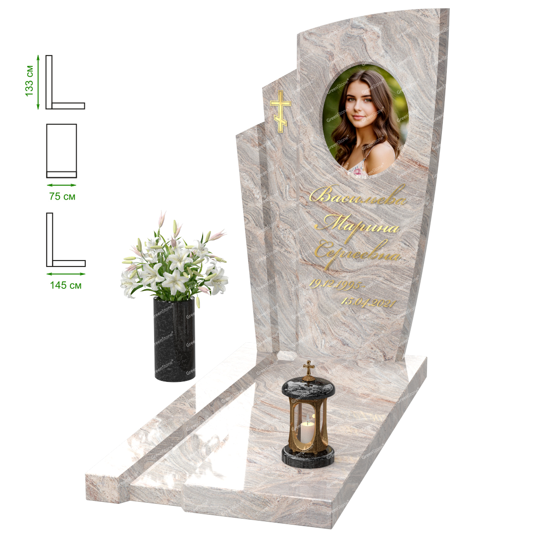 Визуально комплекс отличается от типовой формы не только формой, но и размерами. Массивная стела позволяет дизайнеру реализовать практически любые задумки и пожелания Заказчика, придать готовому изделию солидный вид, раскрыть все достоинства использованного в его изготовлении гранита. Такой габаритный памятник требует профессиональной доставки и установки. Все это также можно заказать в мастерской Грин-Стоун.