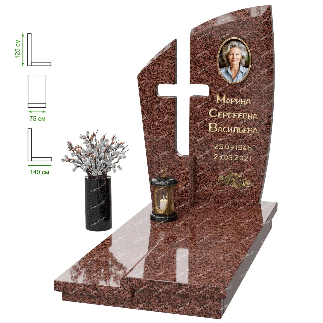 Визуально комплекс отличается от типовой формы не только формой, но и размерами. Массивная стела позволяет дизайнеру реализовать практически любые задумки и пожелания Заказчика, придать готовому изделию солидный вид, раскрыть все достоинства использованного в его изготовлении гранита. Такой габаритный памятник требует профессиональной доставки и установки. Все это также можно заказать в мастерской Грин-Стоун.