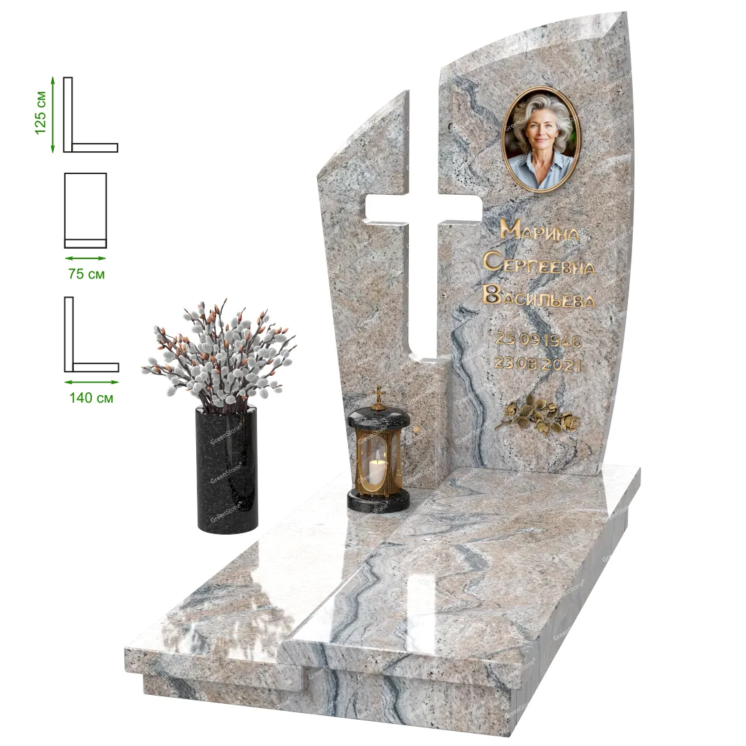 Визуально комплекс отличается от типовой формы не только формой, но и размерами. Массивная стела позволяет дизайнеру реализовать практически любые задумки и пожелания Заказчика, придать готовому изделию солидный вид, раскрыть все достоинства использованного в его изготовлении гранита. Такой габаритный памятник требует профессиональной доставки и установки. Все это также можно заказать в мастерской Грин-Стоун.
