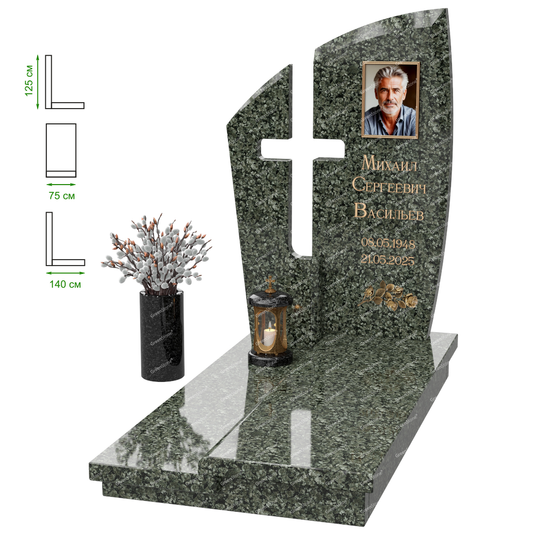 Визуально комплекс отличается от типовой формы не только формой, но и размерами. Массивная стела позволяет дизайнеру реализовать практически любые задумки и пожелания Заказчика, придать готовому изделию солидный вид, раскрыть все достоинства использованного в его изготовлении гранита. Такой габаритный памятник требует профессиональной доставки и установки. Все это также можно заказать в мастерской Грин-Стоун.