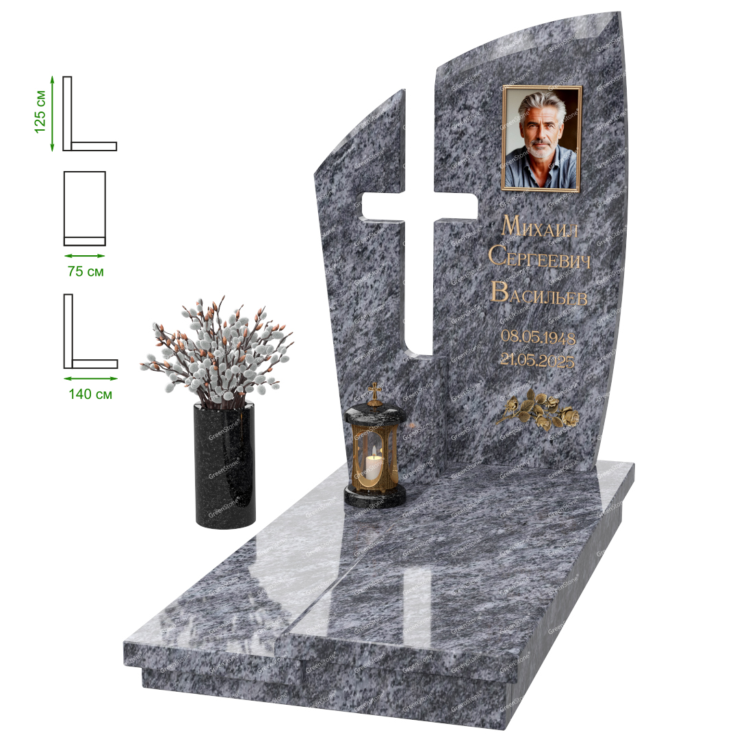 Визуально комплекс отличается от типовой формы не только формой, но и размерами. Массивная стела позволяет дизайнеру реализовать практически любые задумки и пожелания Заказчика, придать готовому изделию солидный вид, раскрыть все достоинства использованного в его изготовлении гранита. Такой габаритный памятник требует профессиональной доставки и установки. Все это также можно заказать в мастерской Грин-Стоун.