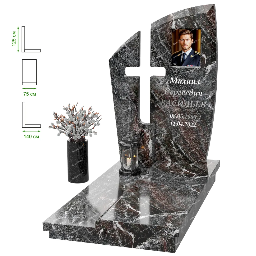 Визуально комплекс отличается от типовой формы не только формой, но и размерами. Массивная стела позволяет дизайнеру реализовать практически любые задумки и пожелания Заказчика, придать готовому изделию солидный вид, раскрыть все достоинства использованного в его изготовлении гранита. Такой габаритный памятник требует профессиональной доставки и установки. Все это также можно заказать в мастерской Грин-Стоун.