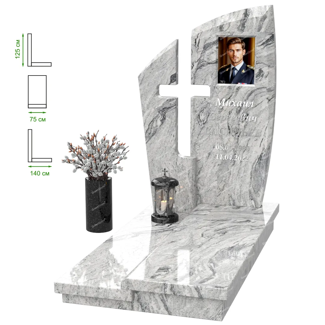 Визуально комплекс отличается от типовой формы не только формой, но и размерами. Массивная стела позволяет дизайнеру реализовать практически любые задумки и пожелания Заказчика, придать готовому изделию солидный вид, раскрыть все достоинства использованного в его изготовлении гранита. Такой габаритный памятник требует профессиональной доставки и установки. Все это также можно заказать в мастерской Грин-Стоун.