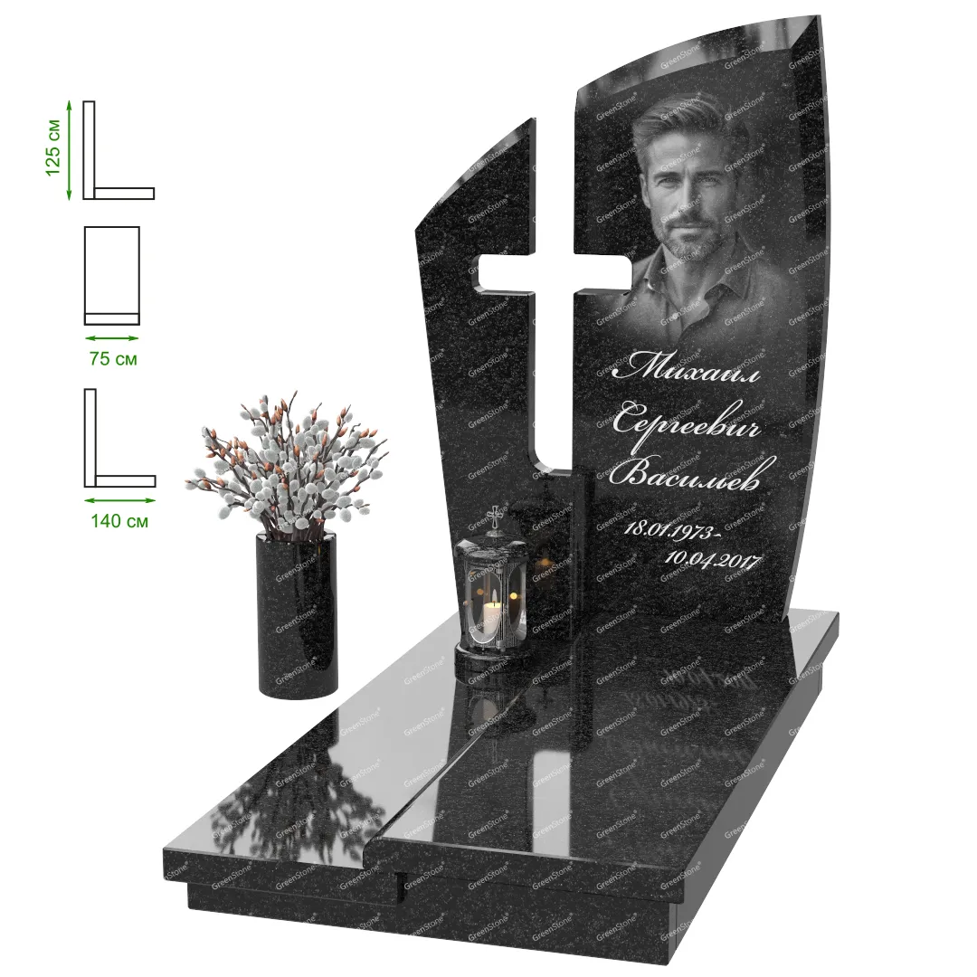Визуально комплекс отличается от типовой формы не только формой, но и размерами. Массивная стела позволяет дизайнеру реализовать практически любые задумки и пожелания Заказчика, придать готовому изделию солидный вид, раскрыть все достоинства использованного в его изготовлении гранита. Такой габаритный памятник требует профессиональной доставки и установки. Все это также можно заказать в мастерской Грин-Стоун.