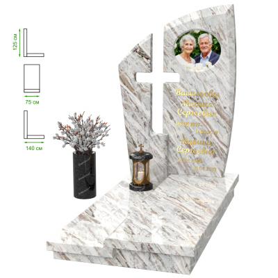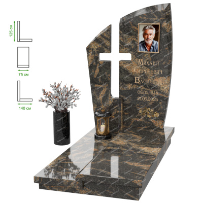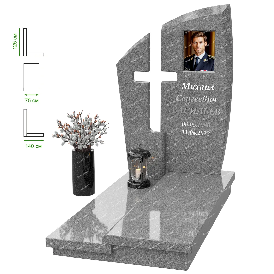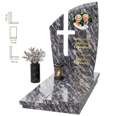Визуально комплекс отличается от типовой формы не только формой, но и размерами. Массивная стела позволяет дизайнеру реализовать практически любые задумки и пожелания Заказчика, придать готовому изделию солидный вид, раскрыть все достоинства использованного в его изготовлении гранита. Такой габаритный памятник требует профессиональной доставки и установки. Все это также можно заказать в мастерской Грин-Стоун.
