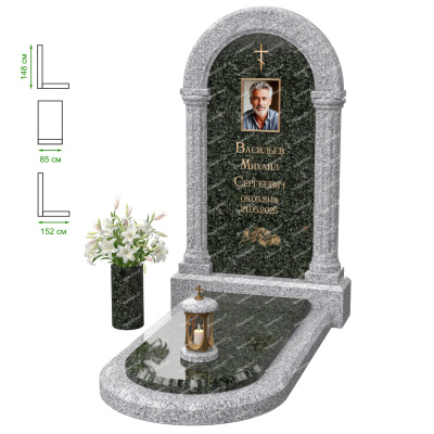 Визуально комплекс отличается от типовой формы не только формой, но и размерами. Массивная стела позволяет дизайнеру реализовать практически любые задумки и пожелания Заказчика, придать готовому изделию солидный вид, раскрыть все достоинства использованного в его изготовлении гранита. Такой габаритный памятник требует профессиональной доставки и установки. Все это также можно заказать в мастерской Грин-Стоун.