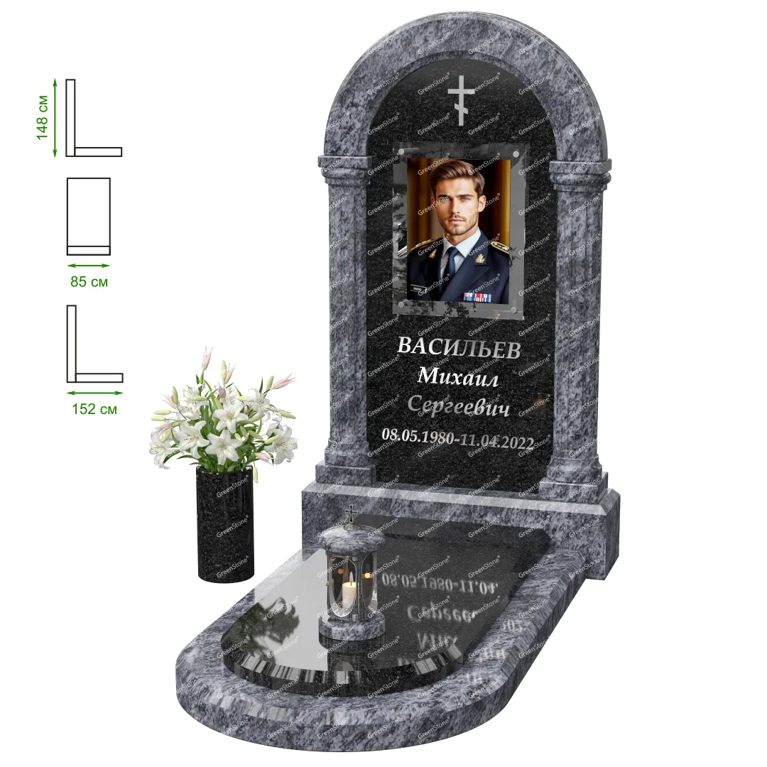 Визуально комплекс отличается от типовой формы не только формой, но и размерами. Массивная стела позволяет дизайнеру реализовать практически любые задумки и пожелания Заказчика, придать готовому изделию солидный вид, раскрыть все достоинства использованного в его изготовлении гранита. Такой габаритный памятник требует профессиональной доставки и установки. Все это также можно заказать в мастерской Грин-Стоун.