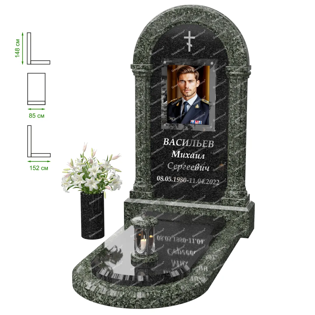 Визуально комплекс отличается от типовой формы не только формой, но и размерами. Массивная стела позволяет дизайнеру реализовать практически любые задумки и пожелания Заказчика, придать готовому изделию солидный вид, раскрыть все достоинства использованного в его изготовлении гранита. Такой габаритный памятник требует профессиональной доставки и установки. Все это также можно заказать в мастерской Грин-Стоун.