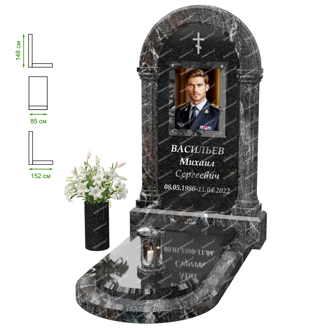 Визуально комплекс отличается от типовой формы не только формой, но и размерами. Массивная стела позволяет дизайнеру реализовать практически любые задумки и пожелания Заказчика, придать готовому изделию солидный вид, раскрыть все достоинства использованного в его изготовлении гранита. Такой габаритный памятник требует профессиональной доставки и установки. Все это также можно заказать в мастерской Грин-Стоун.