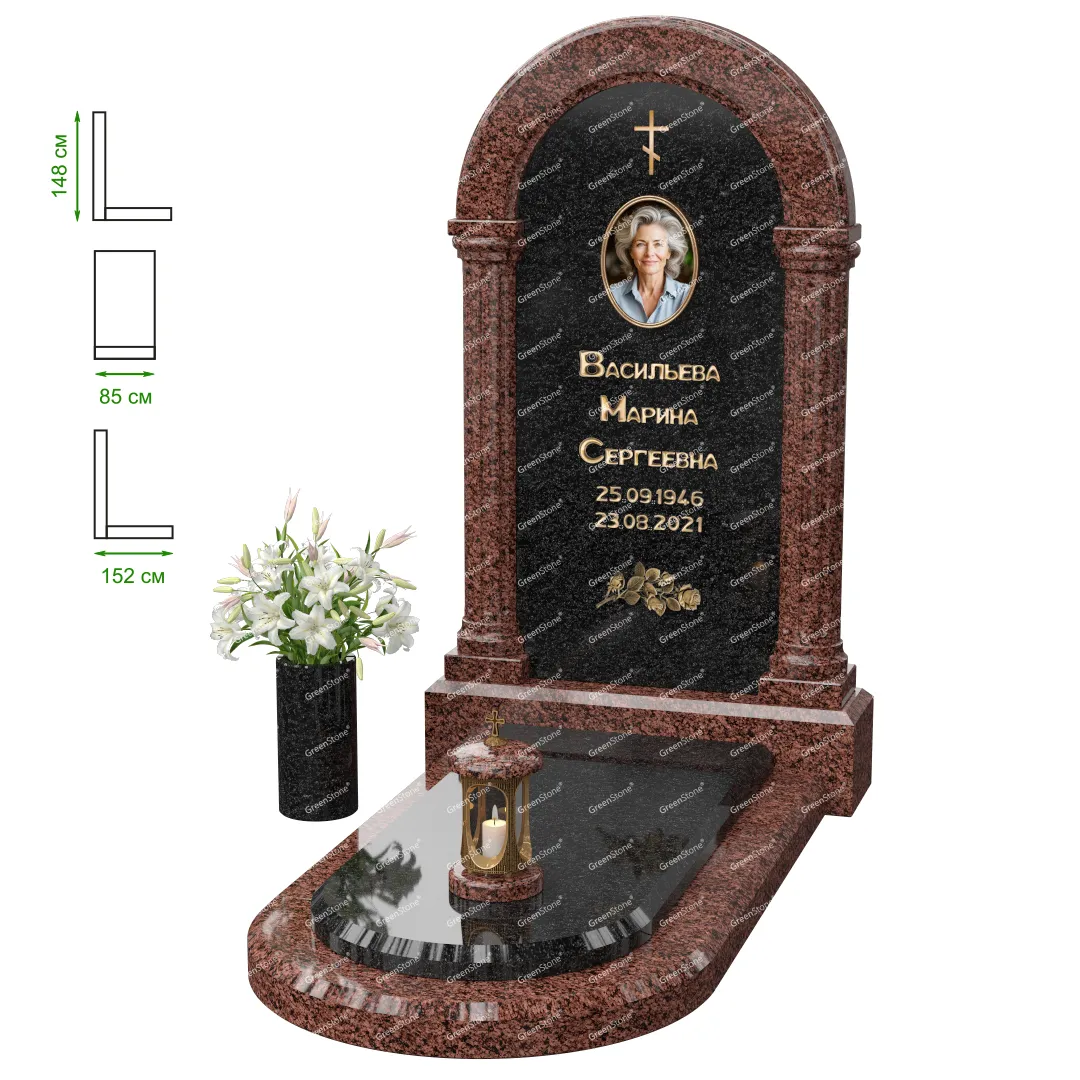 Визуально комплекс отличается от типовой формы не только формой, но и размерами. Массивная стела позволяет дизайнеру реализовать практически любые задумки и пожелания Заказчика, придать готовому изделию солидный вид, раскрыть все достоинства использованного в его изготовлении гранита. Такой габаритный памятник требует профессиональной доставки и установки. Все это также можно заказать в мастерской Грин-Стоун.