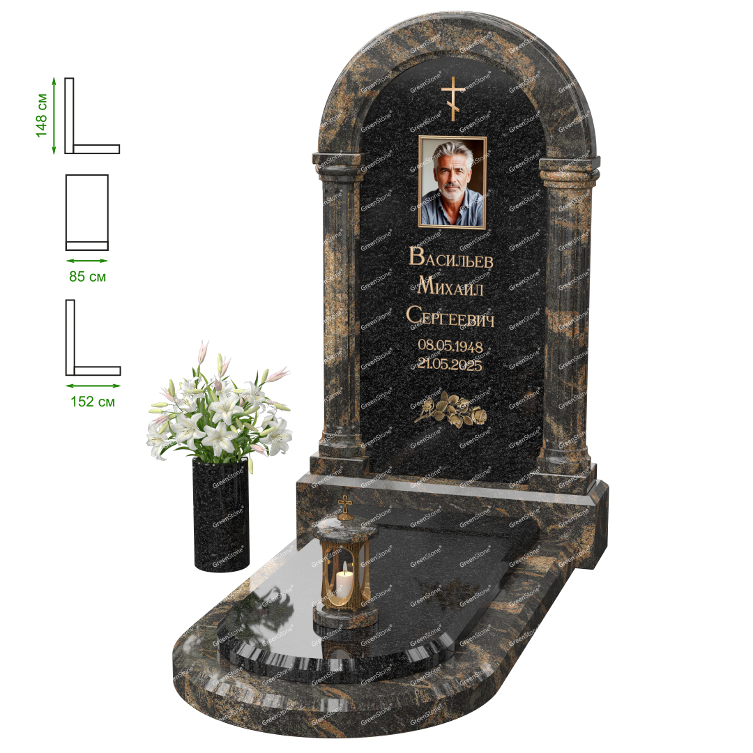 Визуально комплекс отличается от типовой формы не только формой, но и размерами. Массивная стела позволяет дизайнеру реализовать практически любые задумки и пожелания Заказчика, придать готовому изделию солидный вид, раскрыть все достоинства использованного в его изготовлении гранита. Такой габаритный памятник требует профессиональной доставки и установки. Все это также можно заказать в мастерской Грин-Стоун.