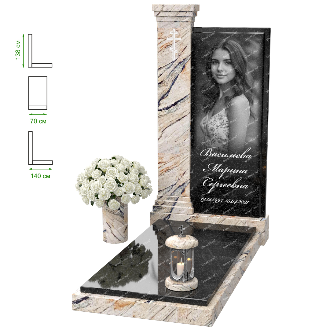Визуально комплекс отличается от типовой формы не только формой, но и размерами. Массивная стела позволяет дизайнеру реализовать практически любые задумки и пожелания Заказчика, придать готовому изделию солидный вид, раскрыть все достоинства использованного в его изготовлении гранита. Такой габаритный памятник требует профессиональной доставки и установки. Все это также можно заказать в мастерской Грин-Стоун.