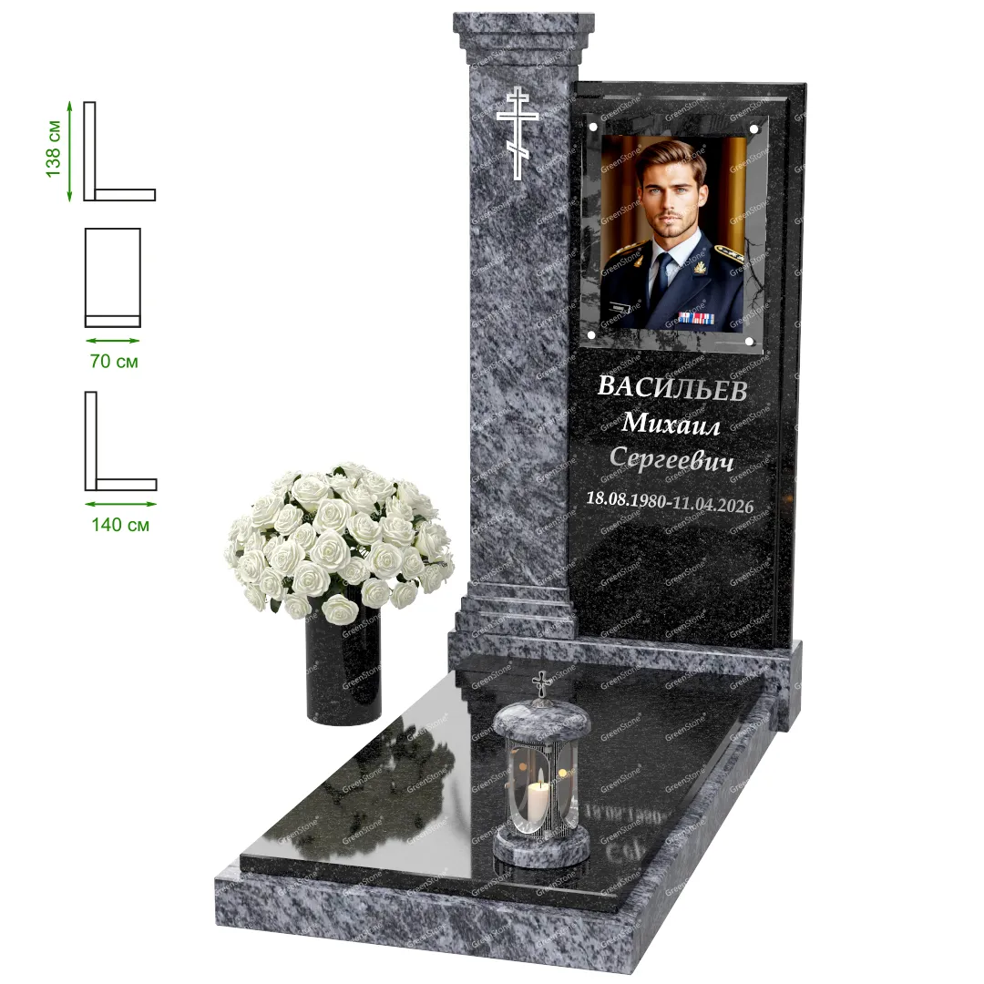 Визуально комплекс отличается от типовой формы не только формой, но и размерами. Массивная стела позволяет дизайнеру реализовать практически любые задумки и пожелания Заказчика, придать готовому изделию солидный вид, раскрыть все достоинства использованного в его изготовлении гранита. Такой габаритный памятник требует профессиональной доставки и установки. Все это также можно заказать в мастерской Грин-Стоун.