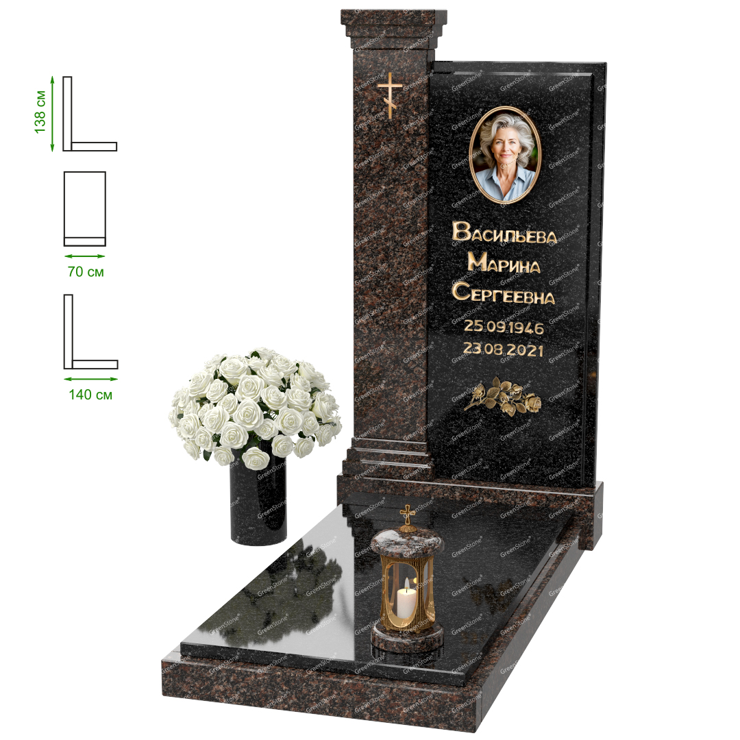 Визуально комплекс отличается от типовой формы не только формой, но и размерами. Массивная стела позволяет дизайнеру реализовать практически любые задумки и пожелания Заказчика, придать готовому изделию солидный вид, раскрыть все достоинства использованного в его изготовлении гранита. Такой габаритный памятник требует профессиональной доставки и установки. Все это также можно заказать в мастерской Грин-Стоун.