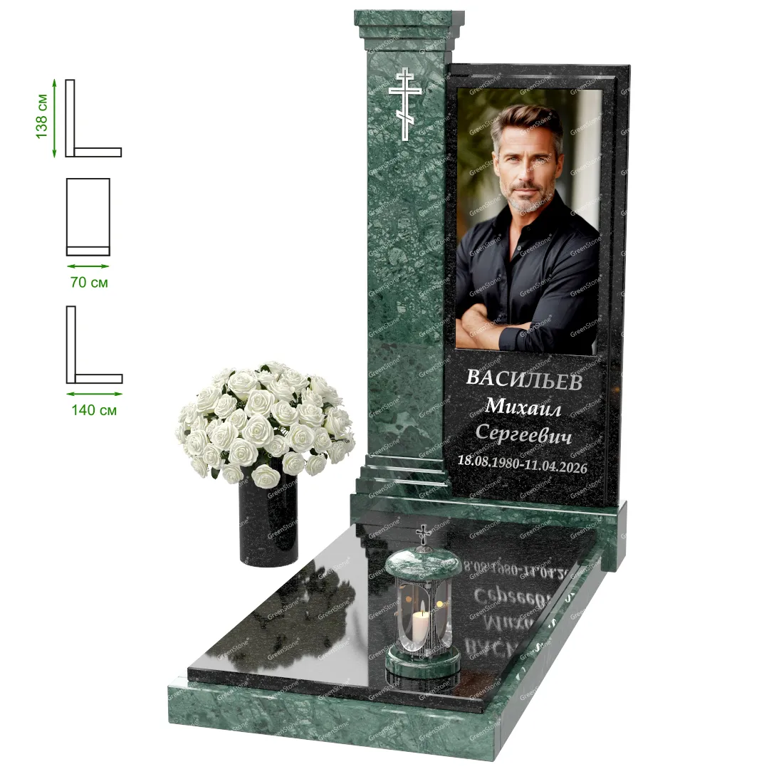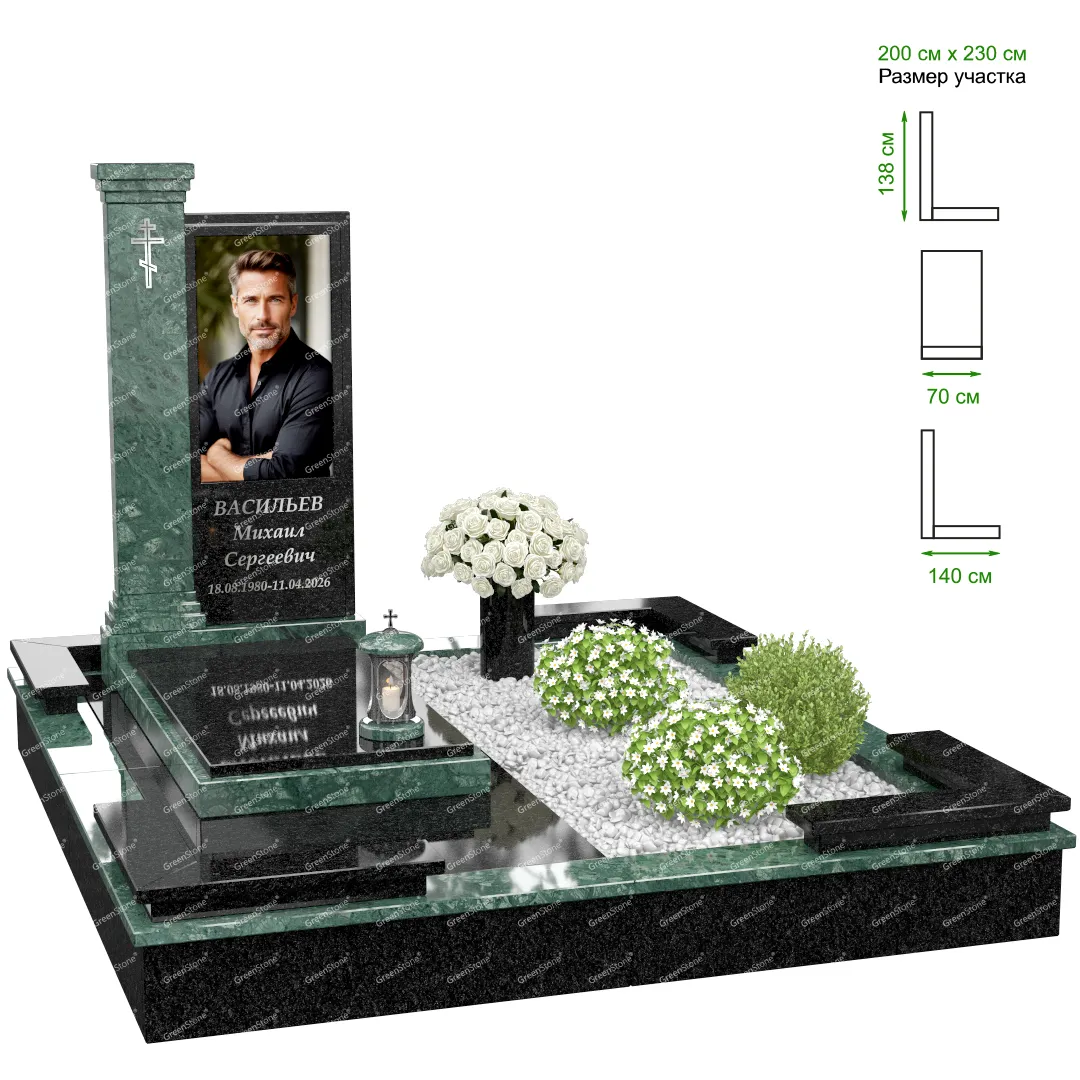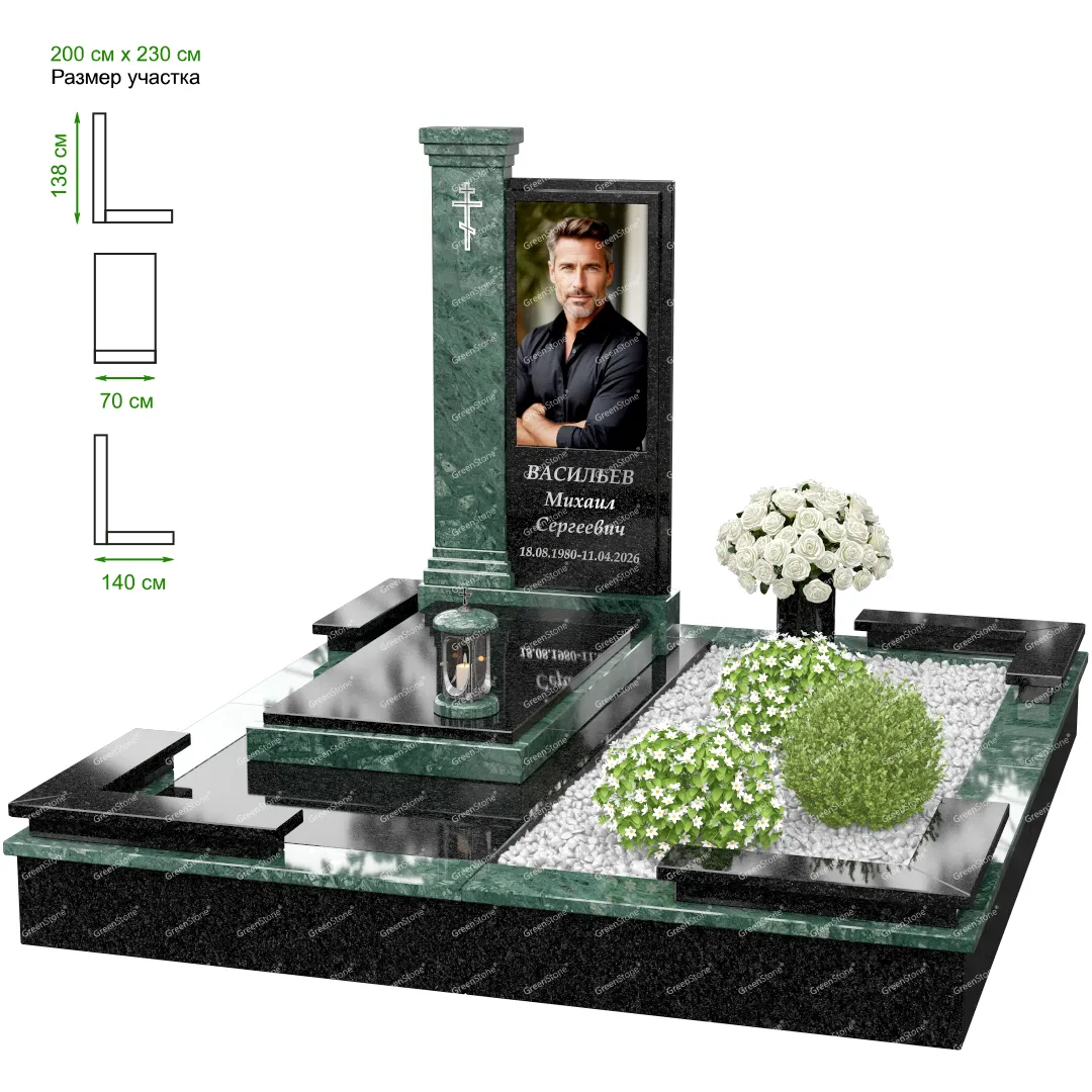 Визуально комплекс отличается от типовой формы не только формой, но и размерами. Массивная стела позволяет дизайнеру реализовать практически любые задумки и пожелания Заказчика, придать готовому изделию солидный вид, раскрыть все достоинства использованного в его изготовлении гранита. Такой габаритный памятник требует профессиональной доставки и установки. Все это также можно заказать в мастерской Грин-Стоун.