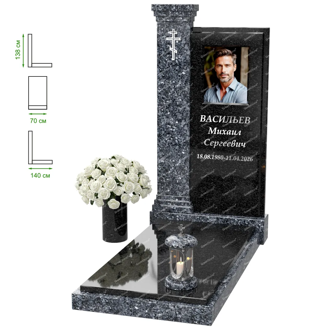 Визуально комплекс отличается от типовой формы не только формой, но и размерами. Массивная стела позволяет дизайнеру реализовать практически любые задумки и пожелания Заказчика, придать готовому изделию солидный вид, раскрыть все достоинства использованного в его изготовлении гранита. Такой габаритный памятник требует профессиональной доставки и установки. Все это также можно заказать в мастерской Грин-Стоун.