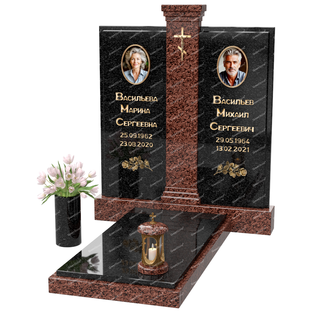 Визуально комплекс отличается от типовой формы не только формой, но и размерами. Массивная стела позволяет дизайнеру реализовать практически любые задумки и пожелания Заказчика, придать готовому изделию солидный вид, раскрыть все достоинства использованного в его изготовлении гранита. Такой габаритный памятник требует профессиональной доставки и установки. Все это также можно заказать в мастерской Грин-Стоун.