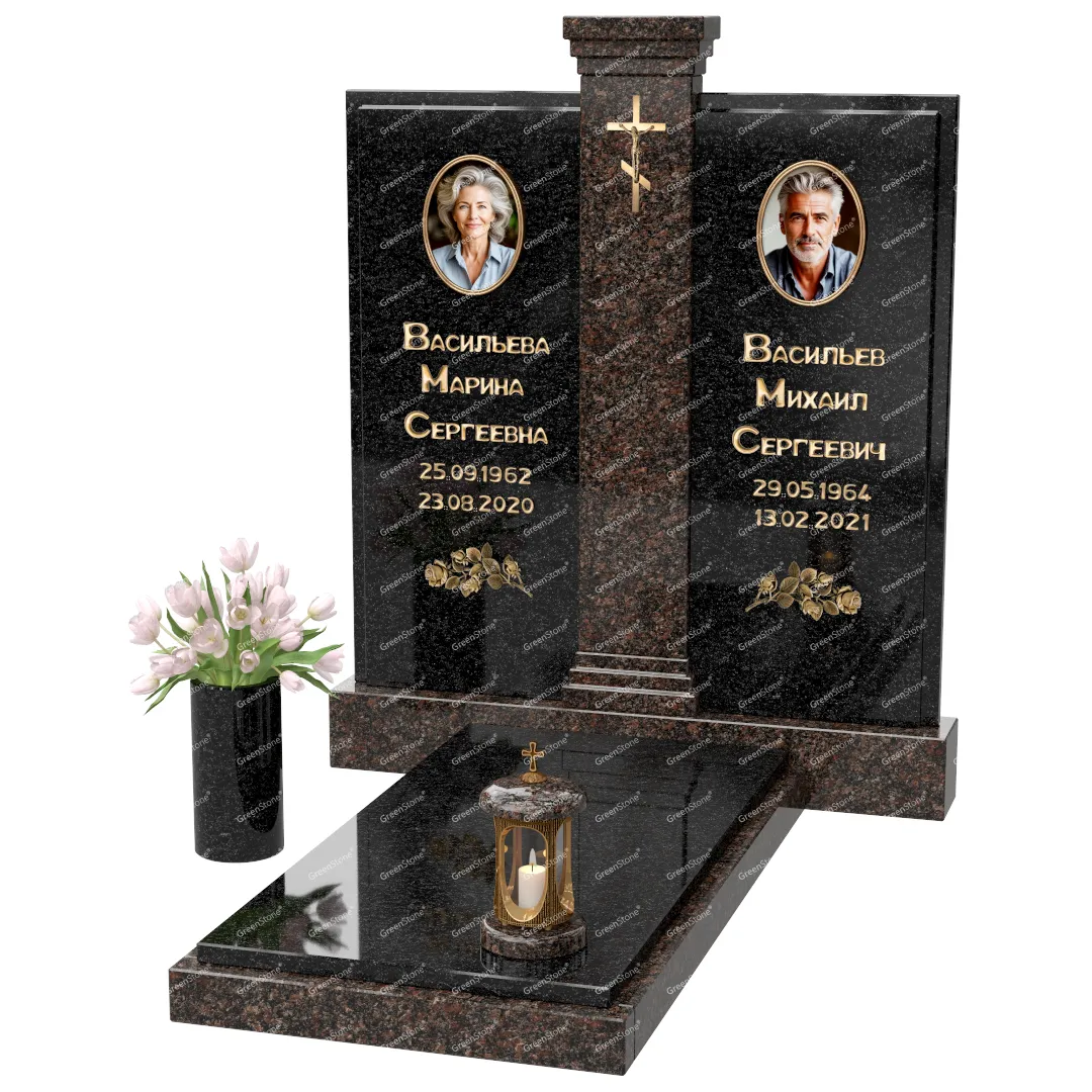 Визуально комплекс отличается от типовой формы не только формой, но и размерами. Массивная стела позволяет дизайнеру реализовать практически любые задумки и пожелания Заказчика, придать готовому изделию солидный вид, раскрыть все достоинства использованного в его изготовлении гранита. Такой габаритный памятник требует профессиональной доставки и установки. Все это также можно заказать в мастерской Грин-Стоун.