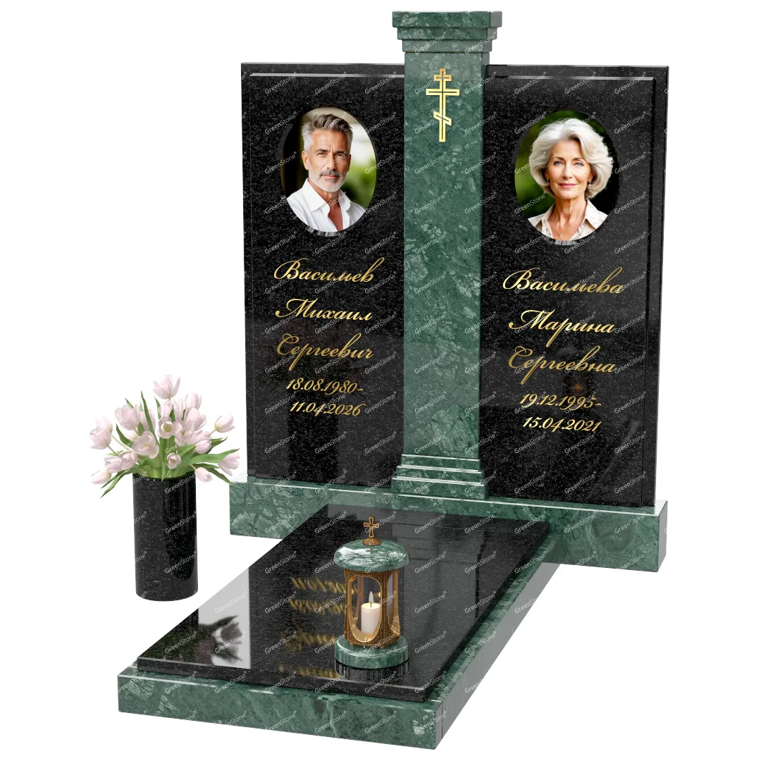 Визуально комплекс отличается от типовой формы не только формой, но и размерами. Массивная стела позволяет дизайнеру реализовать практически любые задумки и пожелания Заказчика, придать готовому изделию солидный вид, раскрыть все достоинства использованного в его изготовлении гранита. Такой габаритный памятник требует профессиональной доставки и установки. Все это также можно заказать в мастерской Грин-Стоун.