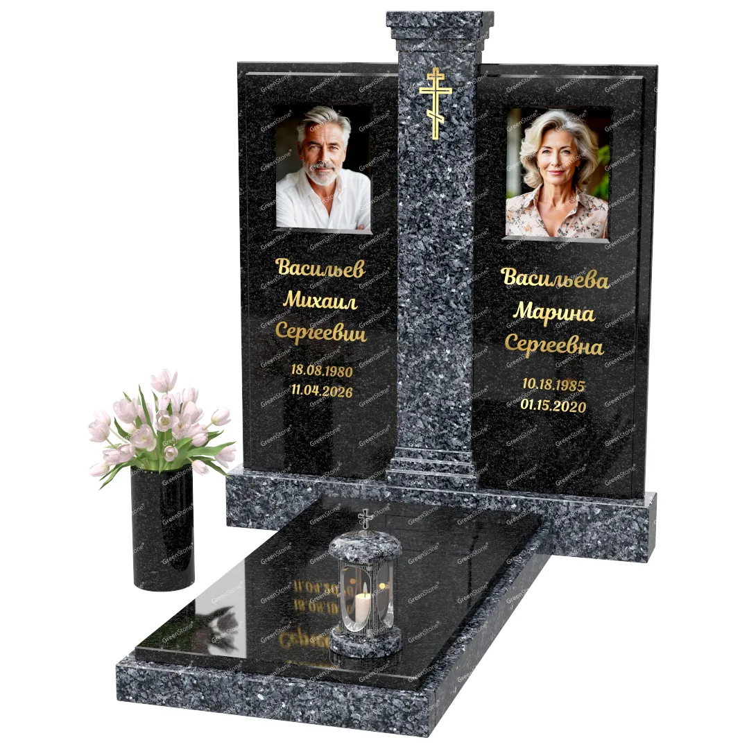 Визуально комплекс отличается от типовой формы не только формой, но и размерами. Массивная стела позволяет дизайнеру реализовать практически любые задумки и пожелания Заказчика, придать готовому изделию солидный вид, раскрыть все достоинства использованного в его изготовлении гранита. Такой габаритный памятник требует профессиональной доставки и установки. Все это также можно заказать в мастерской Грин-Стоун.