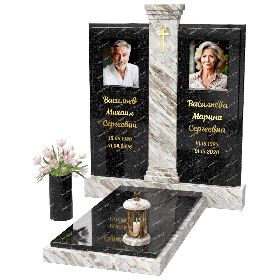 Визуально комплекс отличается от типовой формы не только формой, но и размерами. Массивная стела позволяет дизайнеру реализовать практически любые задумки и пожелания Заказчика, придать готовому изделию солидный вид, раскрыть все достоинства использованного в его изготовлении гранита. Такой габаритный памятник требует профессиональной доставки и установки. Все это также можно заказать в мастерской Грин-Стоун.