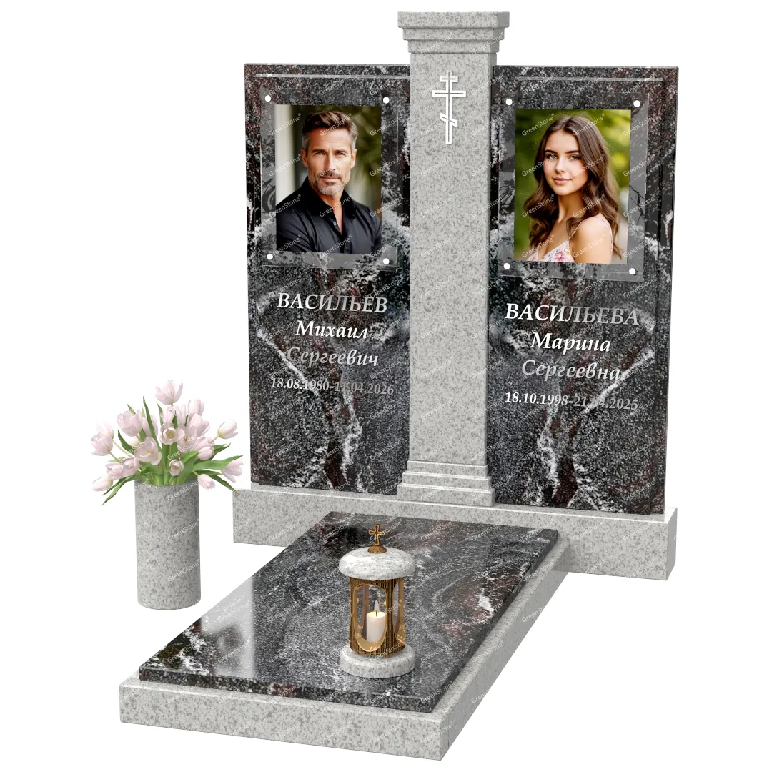 Визуально комплекс отличается от типовой формы не только формой, но и размерами. Массивная стела позволяет дизайнеру реализовать практически любые задумки и пожелания Заказчика, придать готовому изделию солидный вид, раскрыть все достоинства использованного в его изготовлении гранита. Такой габаритный памятник требует профессиональной доставки и установки. Все это также можно заказать в мастерской Грин-Стоун.