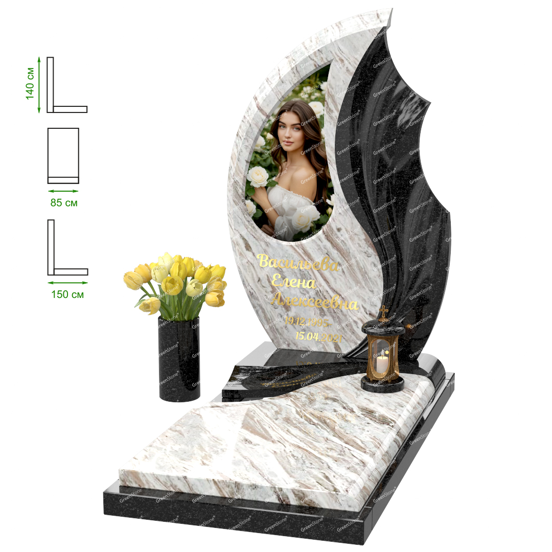 Визуально комплекс отличается от типовой формы не только формой, но и размерами. Массивная стела позволяет дизайнеру реализовать практически любые задумки и пожелания Заказчика, придать готовому изделию солидный вид, раскрыть все достоинства использованного в его изготовлении гранита. Такой габаритный памятник требует профессиональной доставки и установки. Все это также можно заказать в мастерской Грин-Стоун.