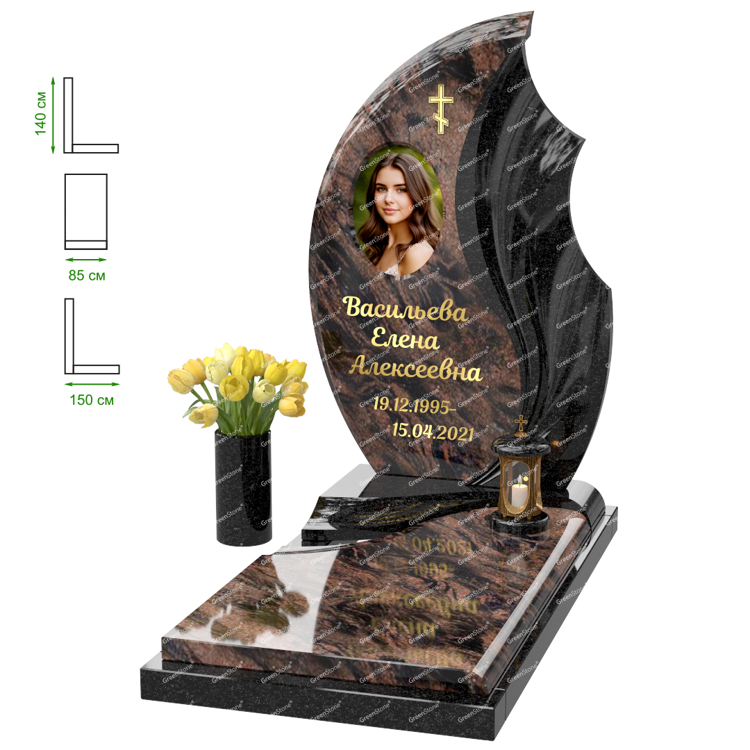 Визуально комплекс отличается от типовой формы не только формой, но и размерами. Массивная стела позволяет дизайнеру реализовать практически любые задумки и пожелания Заказчика, придать готовому изделию солидный вид, раскрыть все достоинства использованного в его изготовлении гранита. Такой габаритный памятник требует профессиональной доставки и установки. Все это также можно заказать в мастерской Грин-Стоун.