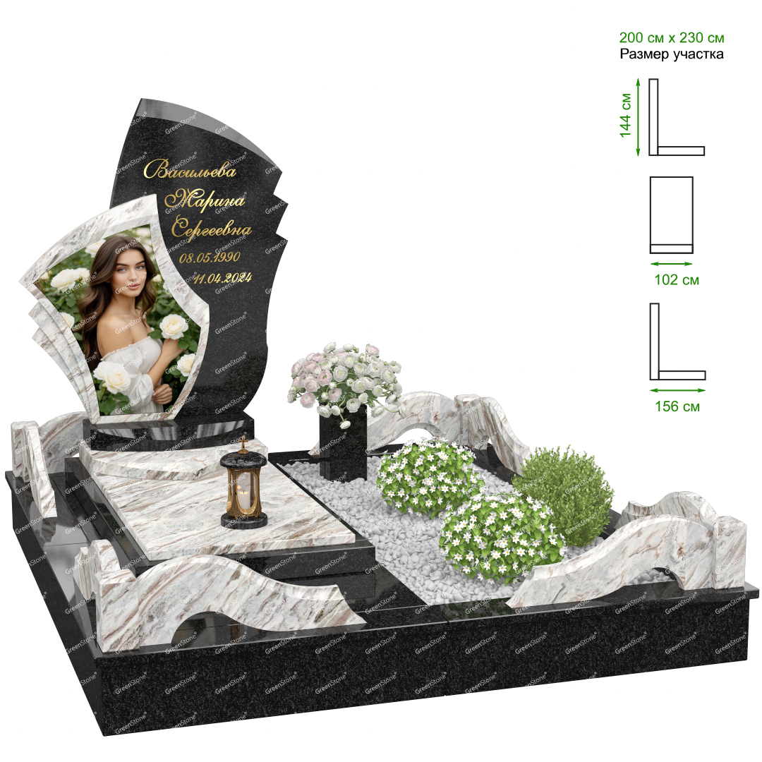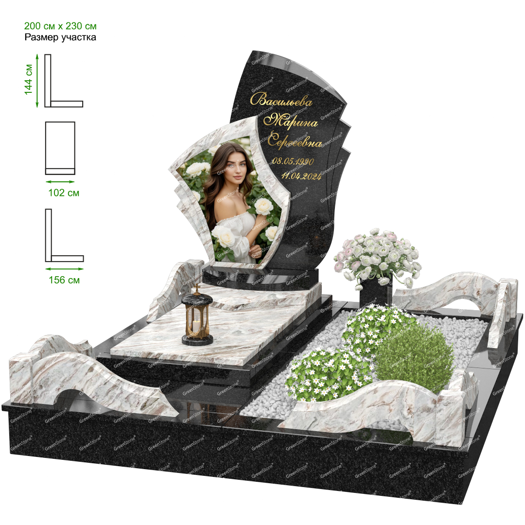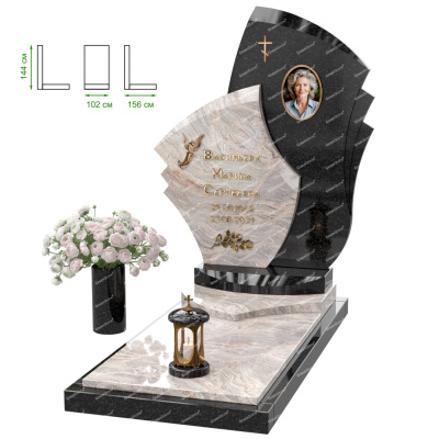 Визуально комплекс отличается от типовой формы не только формой, но и размерами. Массивная стела позволяет дизайнеру реализовать практически любые задумки и пожелания Заказчика, придать готовому изделию солидный вид, раскрыть все достоинства использованного в его изготовлении гранита. Такой габаритный памятник требует профессиональной доставки и установки. Все это также можно заказать в мастерской Грин-Стоун.