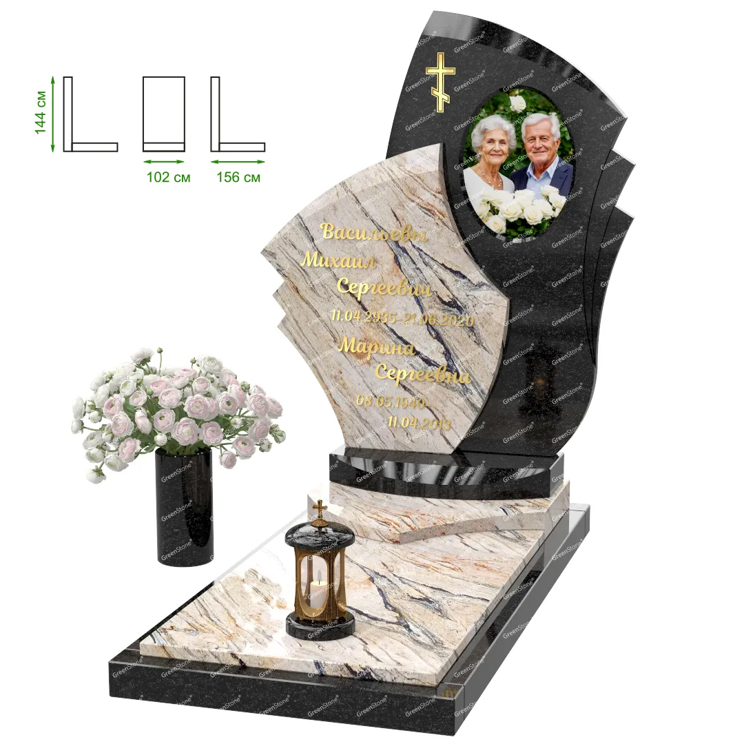 Визуально комплекс отличается от типовой формы не только формой, но и размерами. Массивная стела позволяет дизайнеру реализовать практически любые задумки и пожелания Заказчика, придать готовому изделию солидный вид, раскрыть все достоинства использованного в его изготовлении гранита. Такой габаритный памятник требует профессиональной доставки и установки. Все это также можно заказать в мастерской Грин-Стоун.