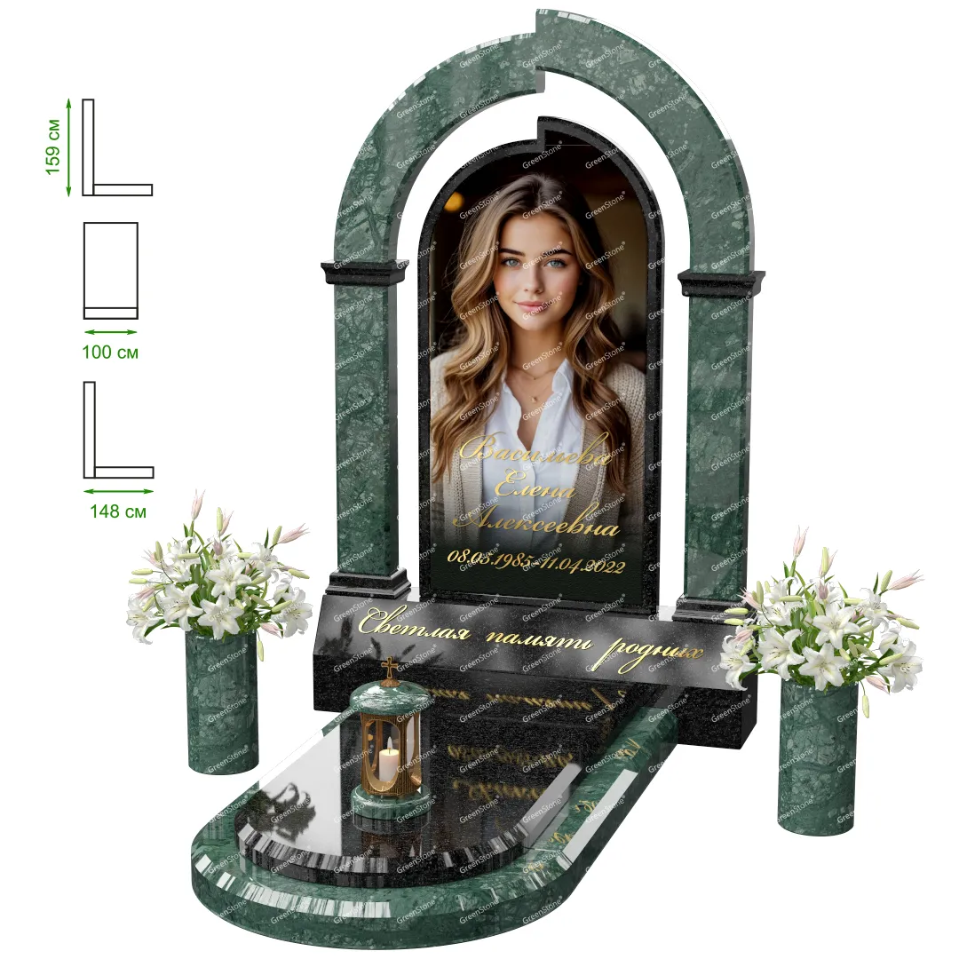 Визуально комплекс отличается от типовой формы не только формой, но и размерами. Массивная стела позволяет дизайнеру реализовать практически любые задумки и пожелания Заказчика, придать готовому изделию солидный вид, раскрыть все достоинства использованного в его изготовлении гранита. Такой габаритный памятник требует профессиональной доставки и установки. Все это также можно заказать в мастерской Грин-Стоун.