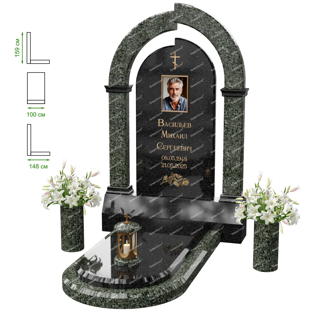 Визуально комплекс отличается от типовой формы не только формой, но и размерами. Массивная стела позволяет дизайнеру реализовать практически любые задумки и пожелания Заказчика, придать готовому изделию солидный вид, раскрыть все достоинства использованного в его изготовлении гранита. Такой габаритный памятник требует профессиональной доставки и установки. Все это также можно заказать в мастерской Грин-Стоун.