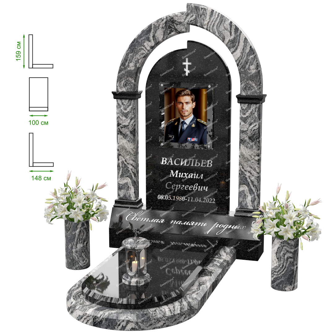Визуально комплекс отличается от типовой формы не только формой, но и размерами. Массивная стела позволяет дизайнеру реализовать практически любые задумки и пожелания Заказчика, придать готовому изделию солидный вид, раскрыть все достоинства использованного в его изготовлении гранита. Такой габаритный памятник требует профессиональной доставки и установки. Все это также можно заказать в мастерской Грин-Стоун.