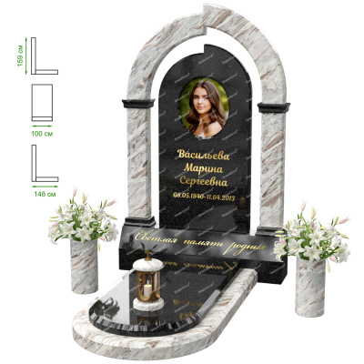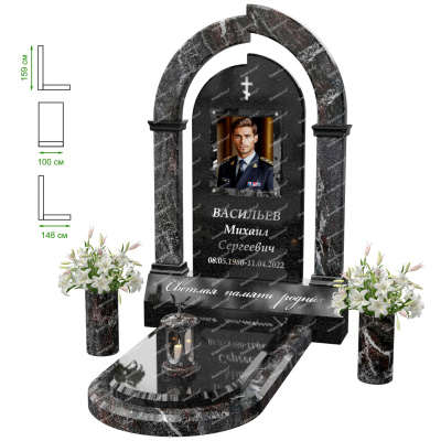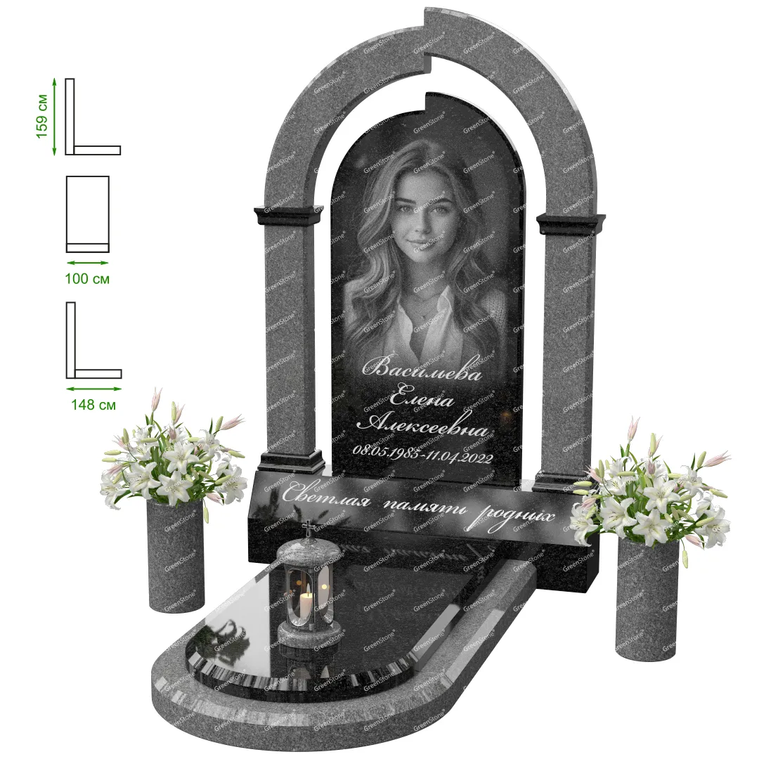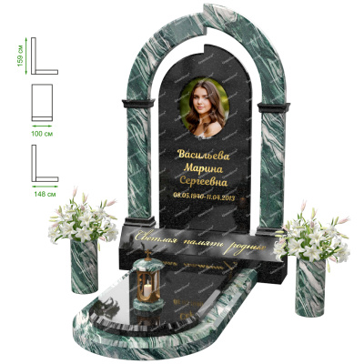 Визуально комплекс отличается от типовой формы не только формой, но и размерами. Массивная стела позволяет дизайнеру реализовать практически любые задумки и пожелания Заказчика, придать готовому изделию солидный вид, раскрыть все достоинства использованного в его изготовлении гранита. Такой габаритный памятник требует профессиональной доставки и установки. Все это также можно заказать в мастерской Грин-Стоун.