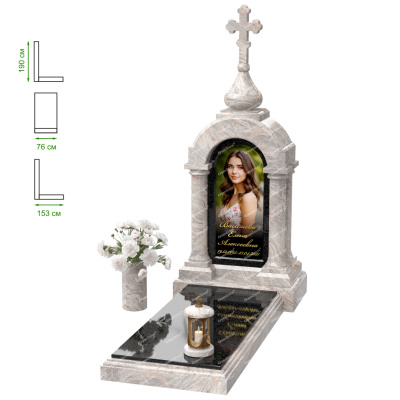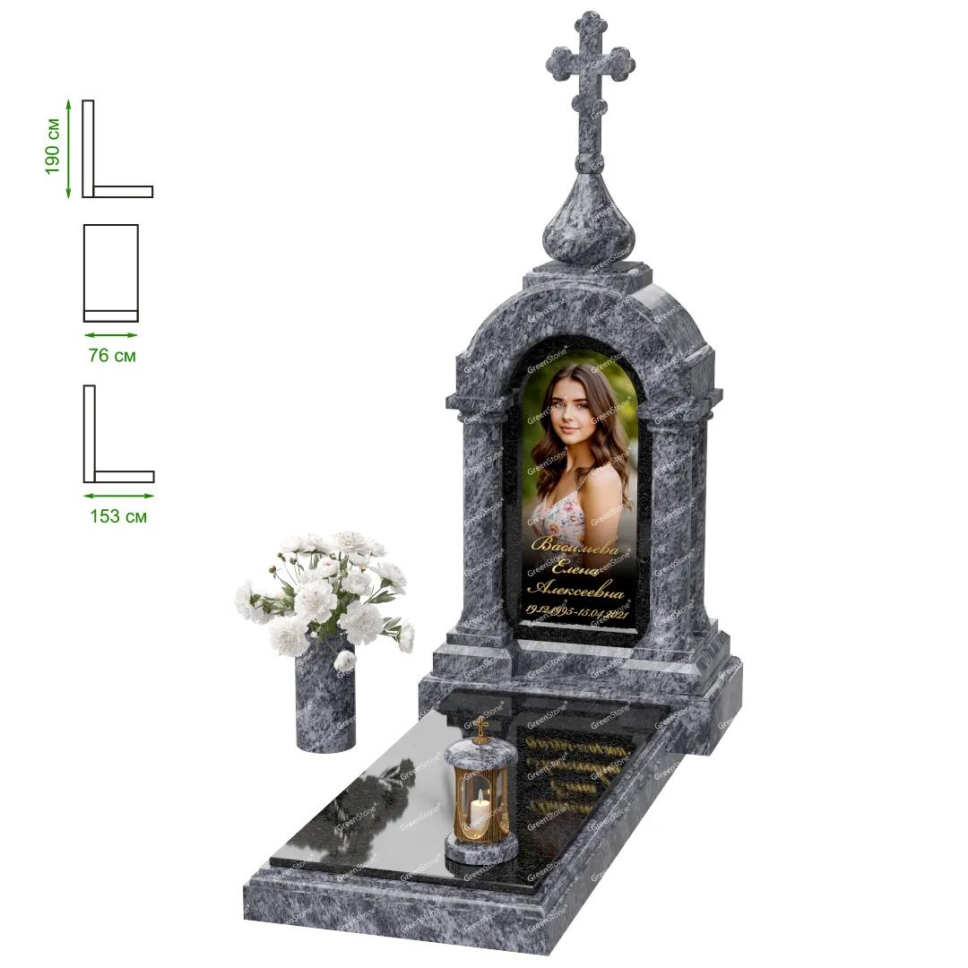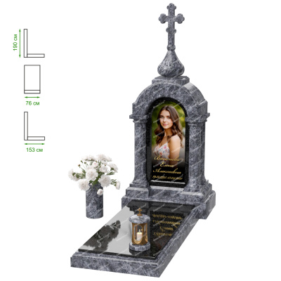 Визуально комплекс отличается от типовой формы не только формой, но и размерами. Массивная стела позволяет дизайнеру реализовать практически любые задумки и пожелания Заказчика, придать готовому изделию солидный вид, раскрыть все достоинства использованного в его изготовлении гранита. Такой габаритный памятник требует профессиональной доставки и установки. Все это также можно заказать в мастерской Грин-Стоун.